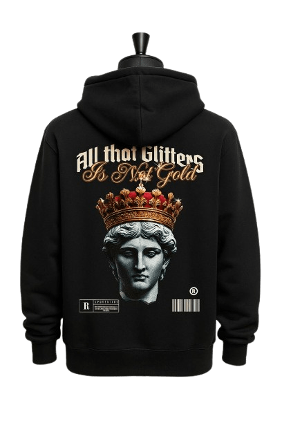 The back features a striking Greco-Roman bust wearing a lavishly detailed jeweled crown, paired with the phrase “All That Glitters Is Not Gold” in gothic and script typography — a reminder that appearances can be deceiving. A barcode graphic and “Restricted” label add a rebellious, high-fashion edge that turns this hoodie into wearable art.